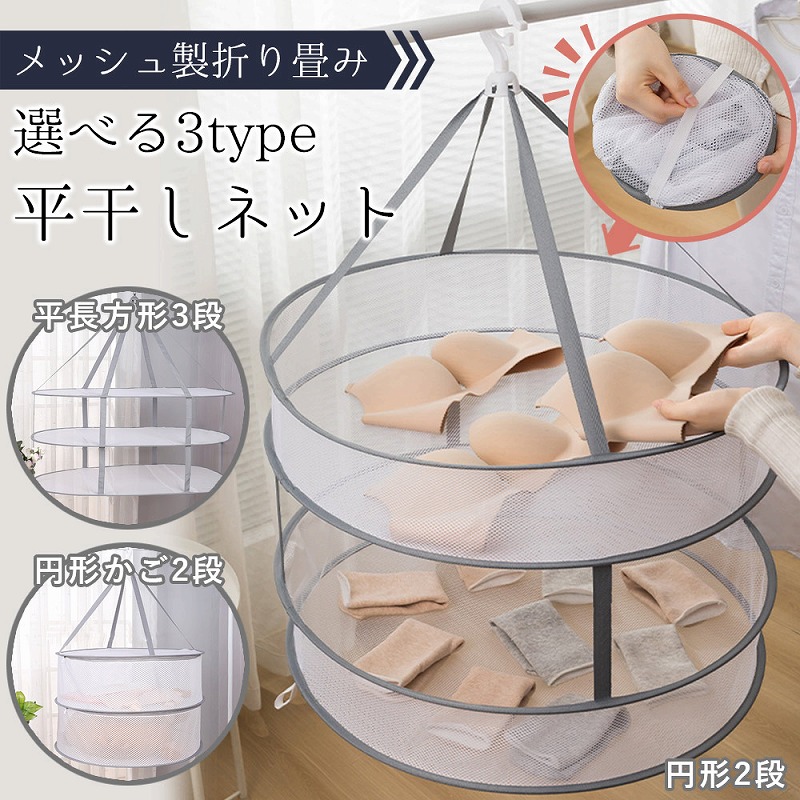 平干しネット 選べる3タイプ セーター ニット 物干し ネット ハンガー 折りたたみ 円形 長方形 かご 2段 3段 セーター干し 影干し 洗濯メッシュ ニット 型崩れ防止 室内干し 屋外対応 落下防止 風よけ ぬいぐるみ 枕 靴下 スリッパ 下着 小物 コンパクト 新生活。