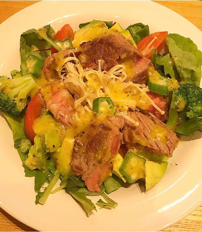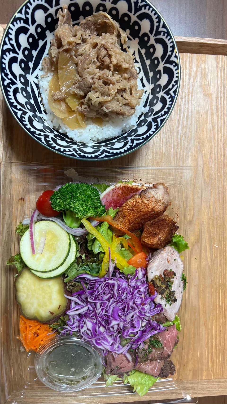 ダイエット食事例 ローストビーフのパワーサラダ、牛丼 福岡のパーソナルジム・ピラティスブログ「ダイエットは明日から」。
