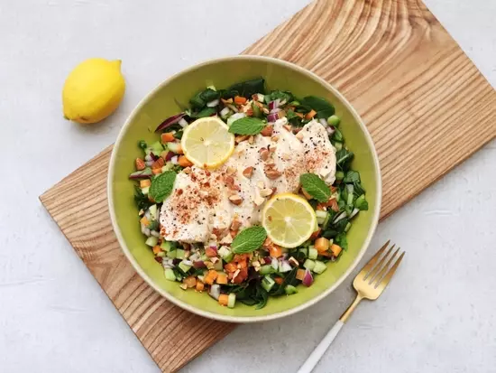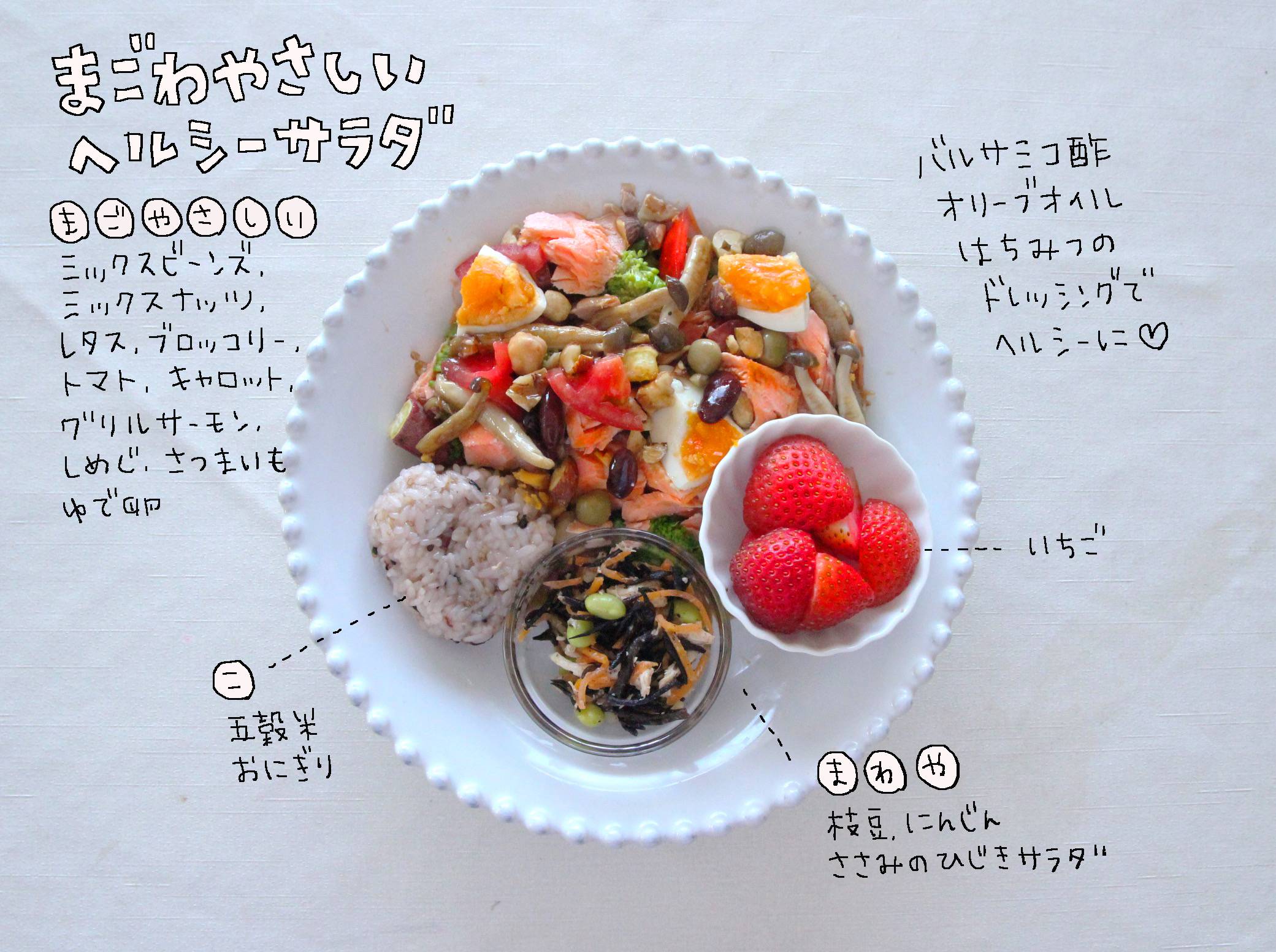 栄養満点♪グリルサーモンのまごわやさしいパワーサラダ。