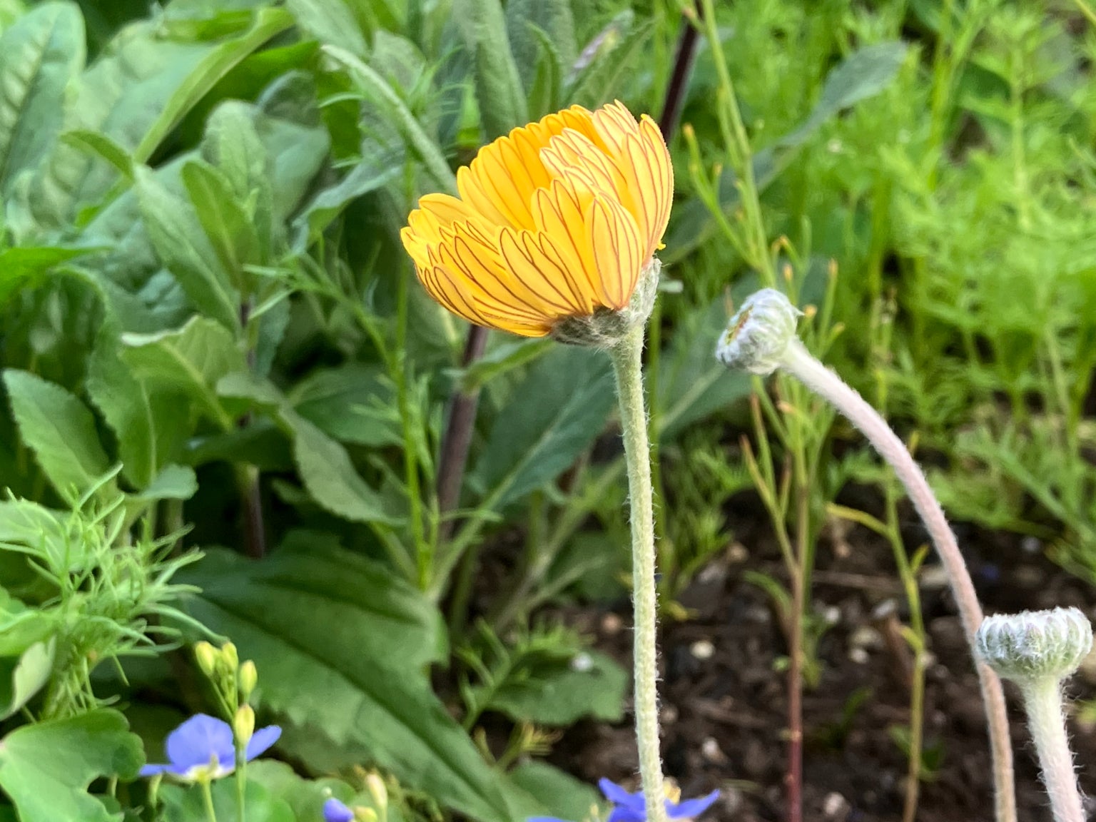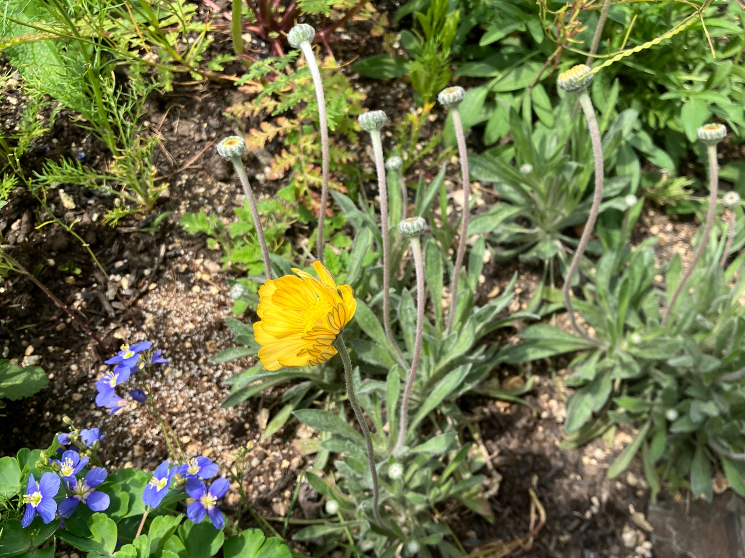 ヒメノキシスサニーダンサーと, 白いマリーゴールド, 我が家はどうもマリーゴールドが, うまく咲かないので、久しぶりに,チャレンジです, 可愛いから🥰, 相変わらずワッサワサの, ガーデンです, 梅雨明けも間も無く,。