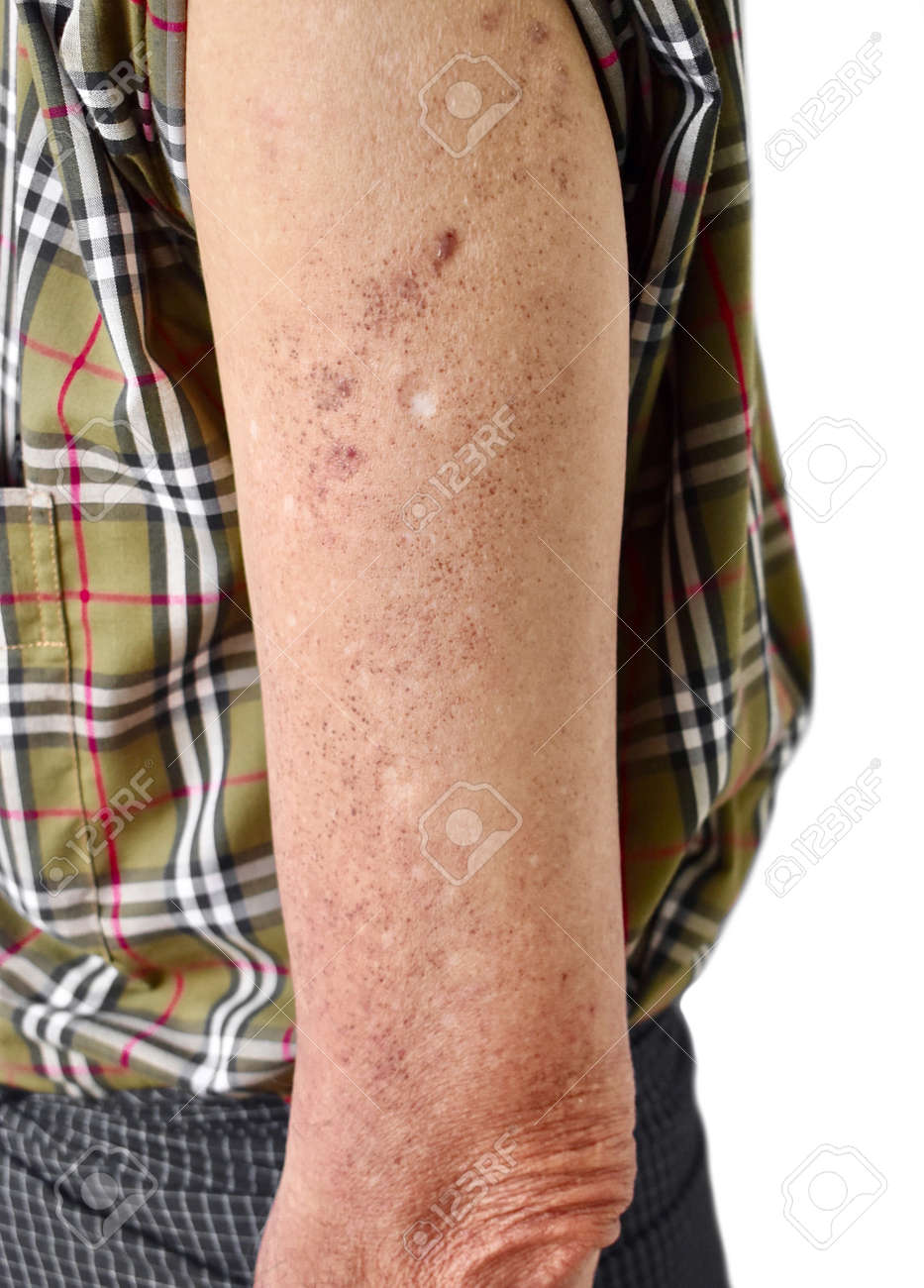 アジアの老人の腕の年齢の斑点と白い斑点。 これらのシミは、茶色、灰色、または黒い斑点であり、肝斑、老人性レンチゴ、太陽レンチジン、または太陽斑とも呼ばれます。の写真素材・画像素材Image 190810289。