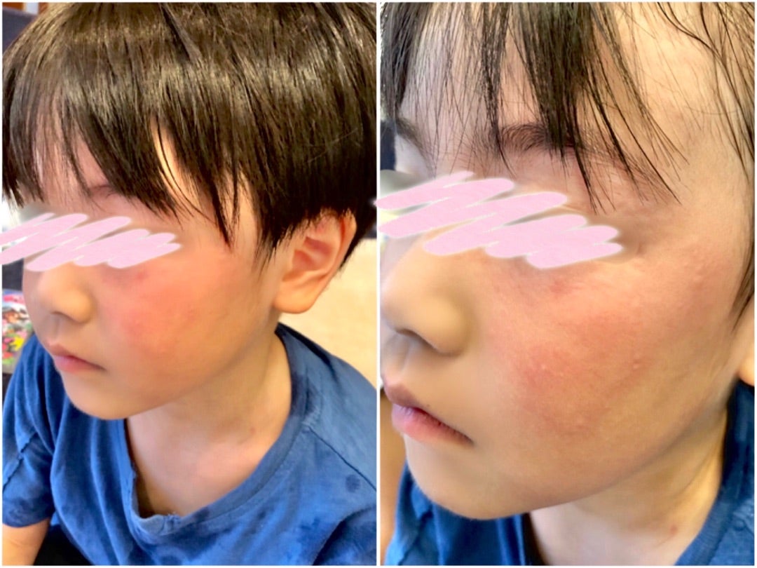 犬アレルギーっぽくて、はるくんと遊んだあとは目の周りだけポツリポツリ赤い膨隆疹がでるのだけど😳今日はいつもよりひどい!はるくん、今日は息子が引っ繰り返りそうなほど体を全力でくっつけてゴロゴロしてたからかな 😭すぐ離したけど、つらい大きくなったら。