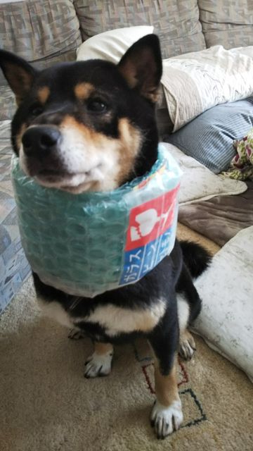 手作りエリザべスカラーをつけられて固まる柴犬ミク 作り方。
