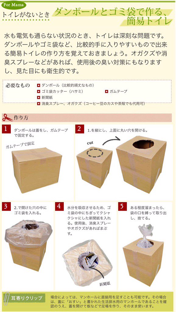 ダレノガレ明美 on X: "簡易トイレの作り方 ダンボールとゴミ袋等簡易トイレトイレ熊本県の地震情報を配信していますhttps:t.co TUSMZmO2Yl"X。