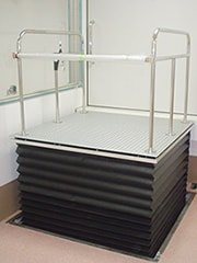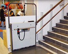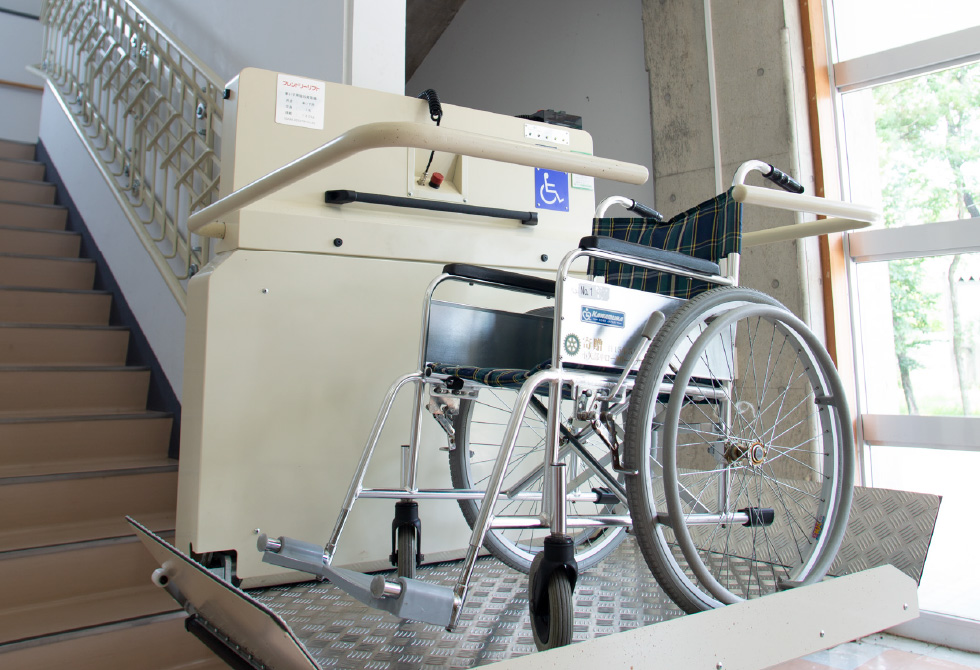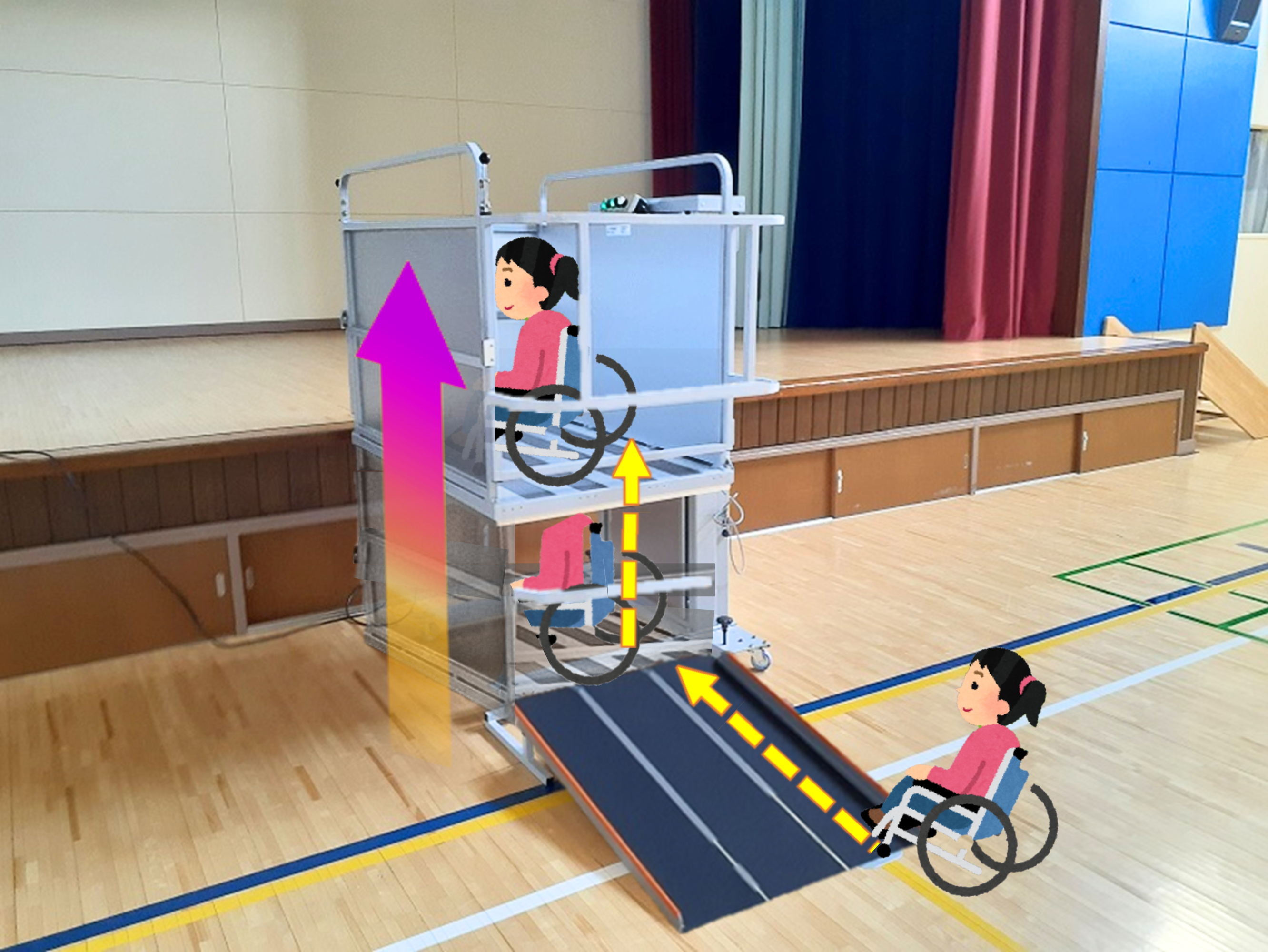 小学校へ段差解消機NKL1000C設置。車いすで体育館ステージへ登壇できるように北日本メディカル。