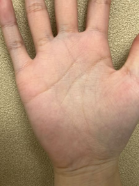 50代女性 手相🖐️粘り強い頑張り屋まず全体的に線が薄く、協調性がありますが、線の数自体は多く繊細な傾向です! 感情線はまっすぐで物事をハッキリと伝えられるタイプ♪感情線の支線が延びて知能線とつながり、後天的ますかけ線になっているため、粘り強く頑張っ。