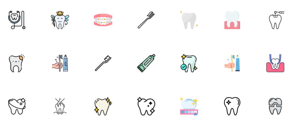 無料素材歯科医がテーマのベクターイラストアイコンセット。歯医者さんや歯ブラシにドリルなど。