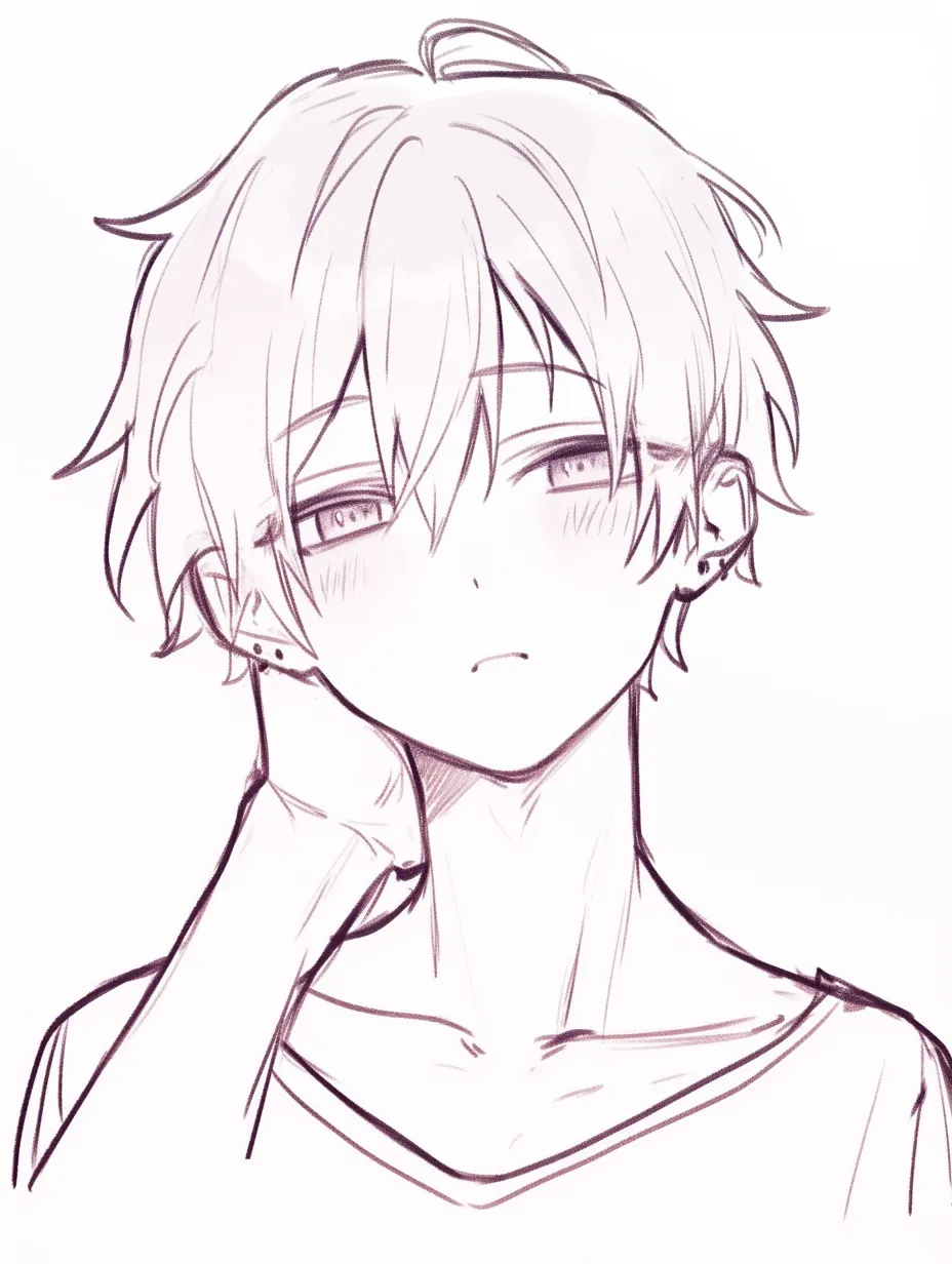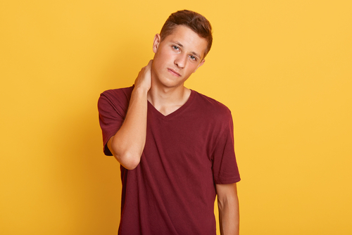 首に手を当てるポーズの男の子イラスト・フリー素材なら「シンテリ」。