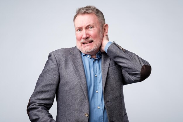 首に手を当ててイライラするスーツ姿のシニア男性Premium写真。