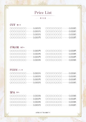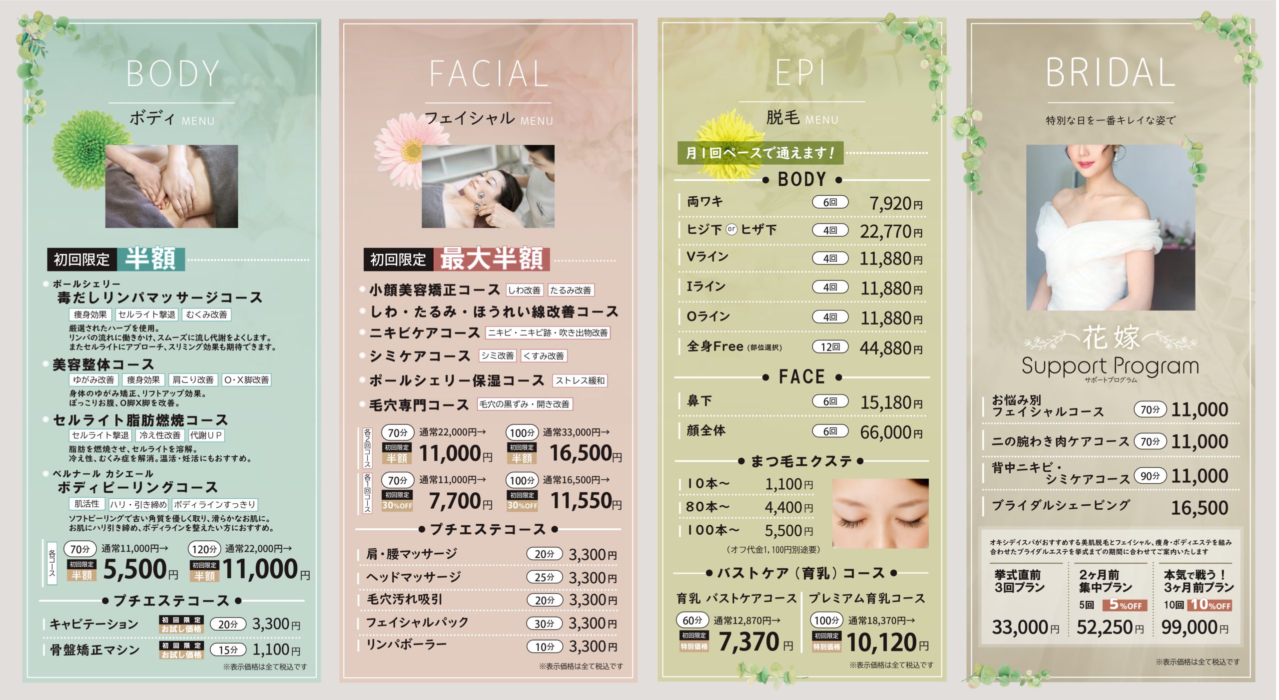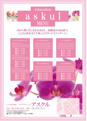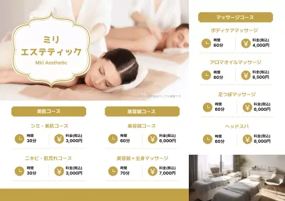 美容・エステサロンのメニュー表無料テンプレート・デザインサンプル - ネット印刷グラフィック。