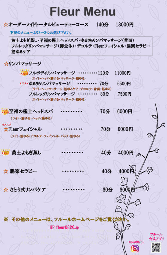 メニュー表です😀✨💜🤍ブログ出張のリラクゼーションならひといき。