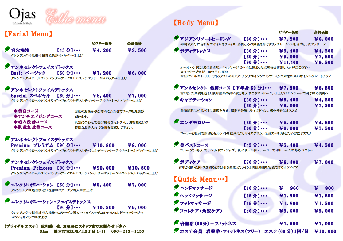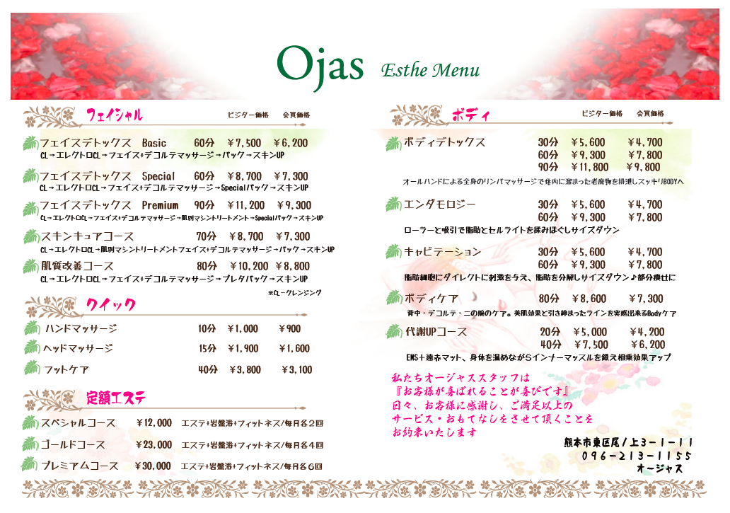 Ojasエステメニュー表熊本の脱毛・エステサロンならOjas オージャス Beauty & Health Care salon。