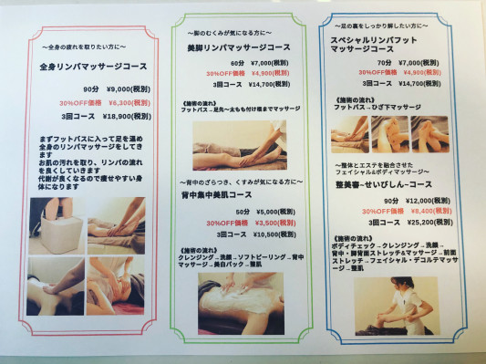 オイルマッサージメニュー表♪CALTY JAPANキャルティージャパン。