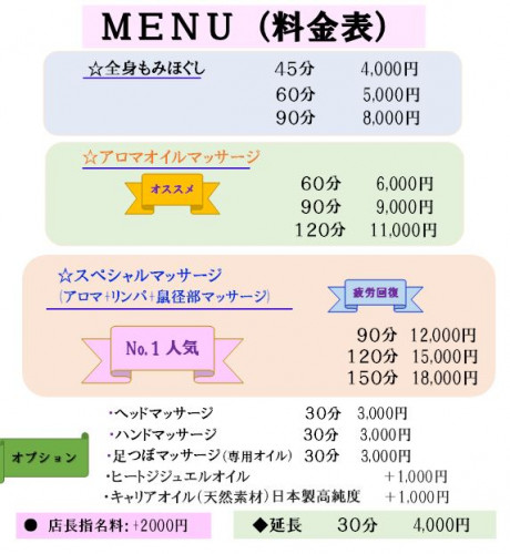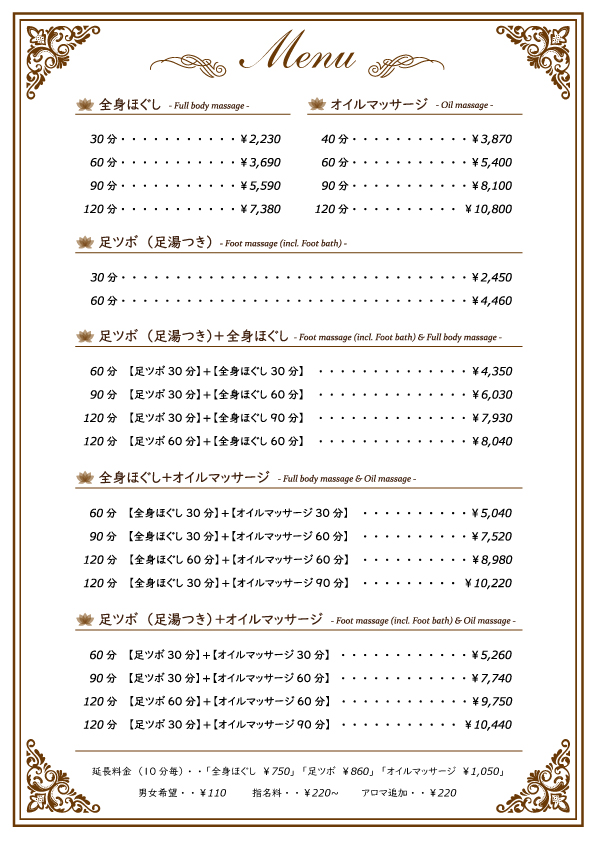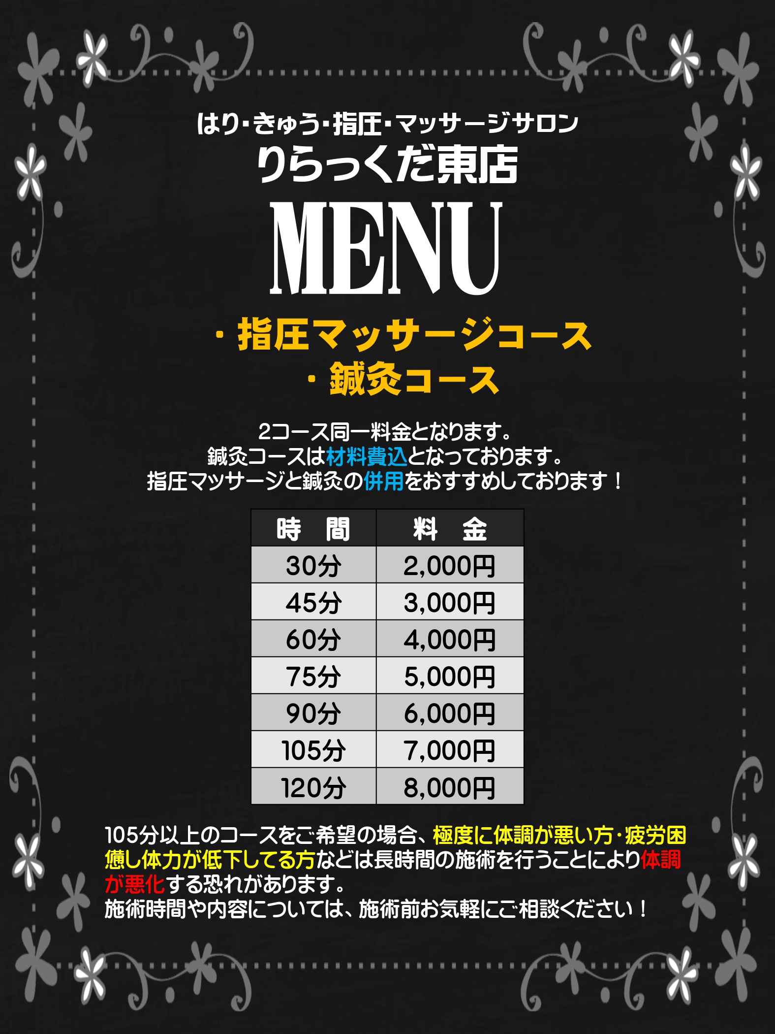 メニュー表 - 北越谷駅 徒歩2分 リラクゼーション マッサージ 39Raku Raku。