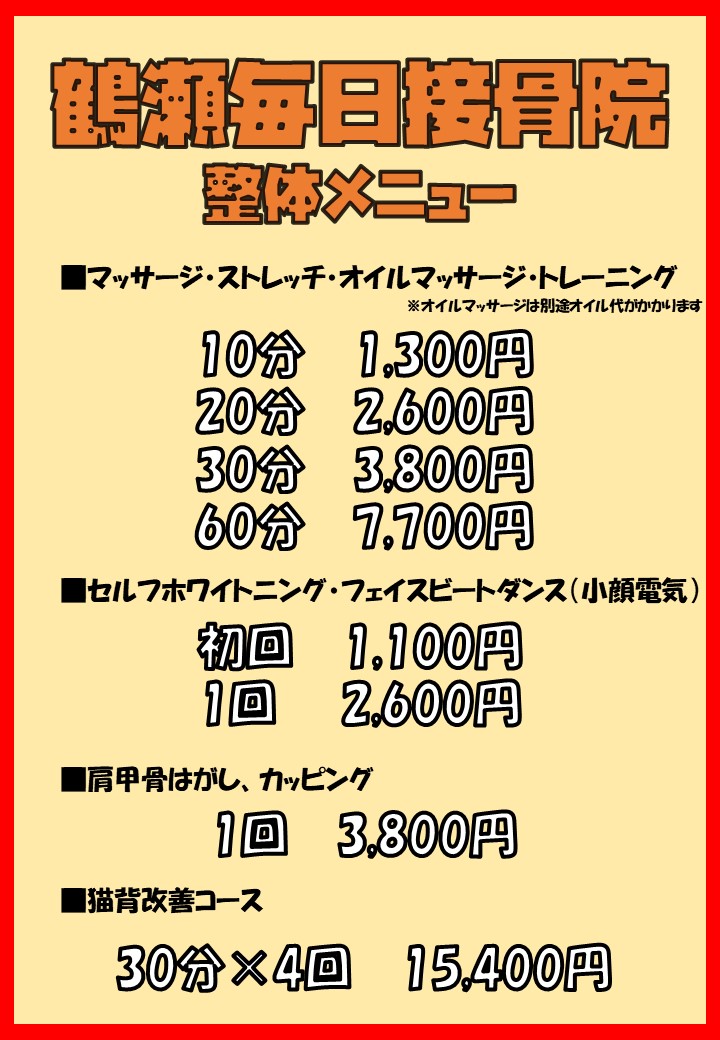 整体メニュー表自費診療富士見市の整骨院・接骨院 鶴瀬毎日接骨院のホームページ。