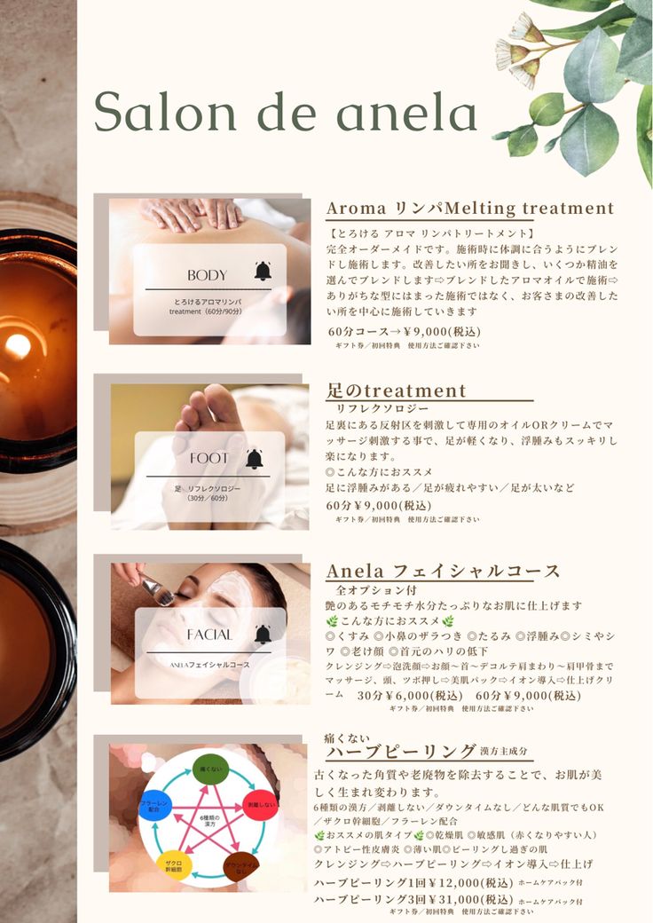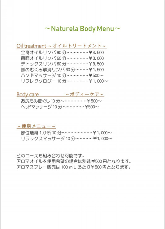 ナチュレ 施術メニュー表ナチュレ オールハンドのリンパ・エステサロン、好評のよもぎ蒸し、小顔フェイシャル、体質改善、人気です。