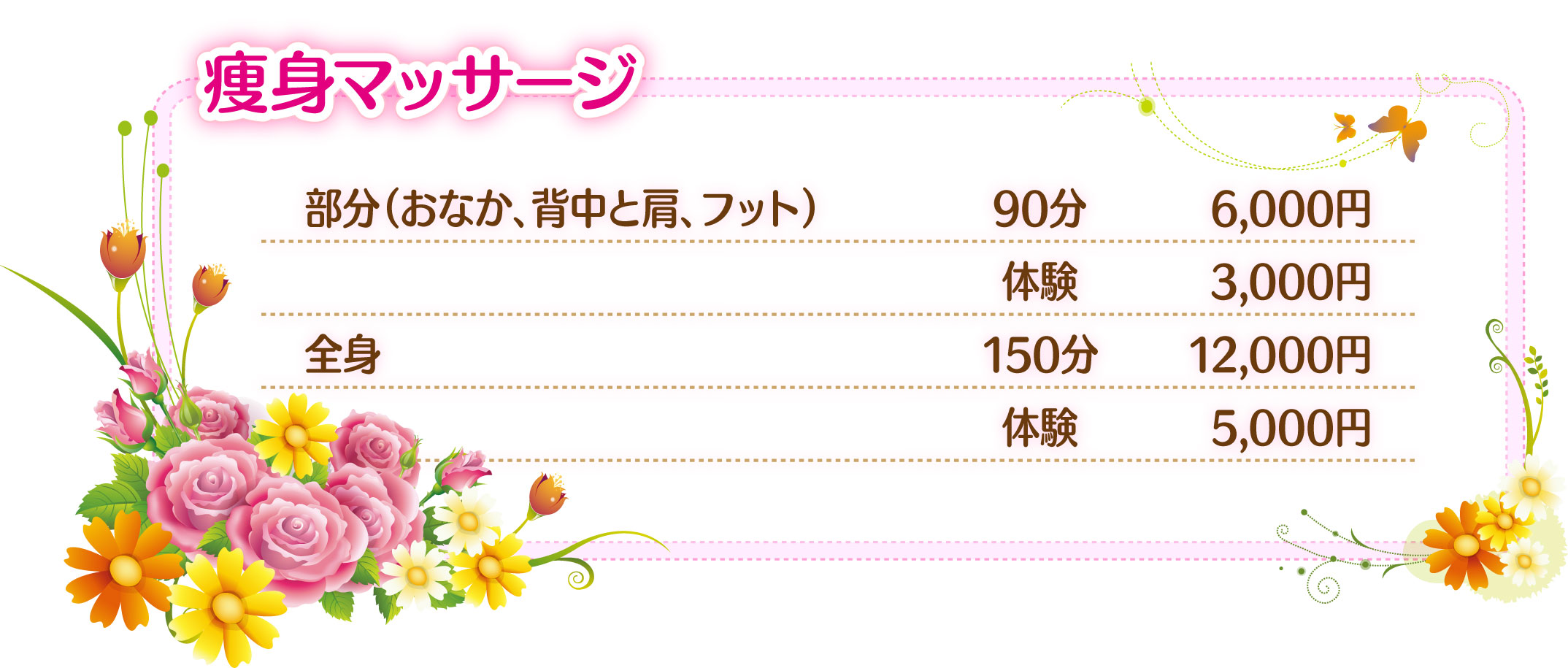 メニュー表:痩身マッサージ耳ツボダイエット エステティックサロンケイズ。