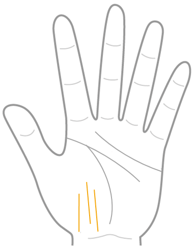 陰徳線生命線の内側に位置し、親指の下の金星丘から手首側に向かって縦に伸びる線。慈愛に満ちた人や、他人に知られずに良い行いをする人格者に現れるとされています。しかし、他人のために尽くしすぎて自分を見失うことがないよう注意が必要です複数本ある場合は自己。