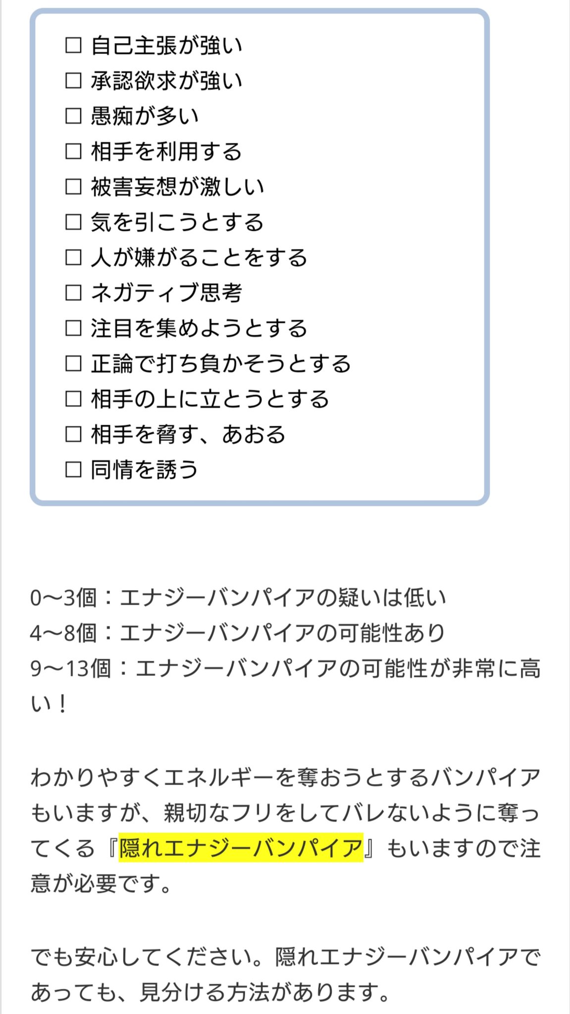 Piccolinaひなぎくぴょん♪ on X: " スピリチュアル なものは特に興味ないけどネットでエナジーバンパイアというワードが出てきて見てみた。 クソ旦那 これじゃね?w 「正論で~」てとこだけは違うけど。奴は悪知恵しか働かん、正論言うてる妻を怒鳴りつけて自分が。
