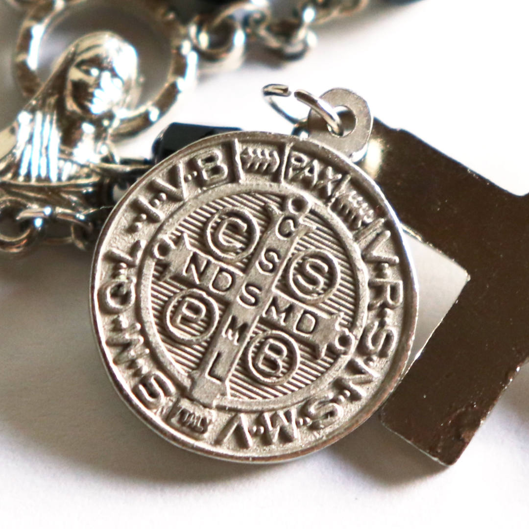 聖ベネディクトのメダイ付バックミラー用ロザリオ悪魔祓いお守り聖人・車内アクセサリ。