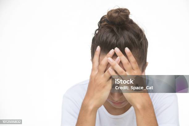 悲しい泣く女の手で彼女の顔を覆っていますうつ病絶望ストレス障害概念白い背景に分離 - 泣くのストックフォトや画像を多数ご用意 - 泣く, 眼, 1人- iStock。