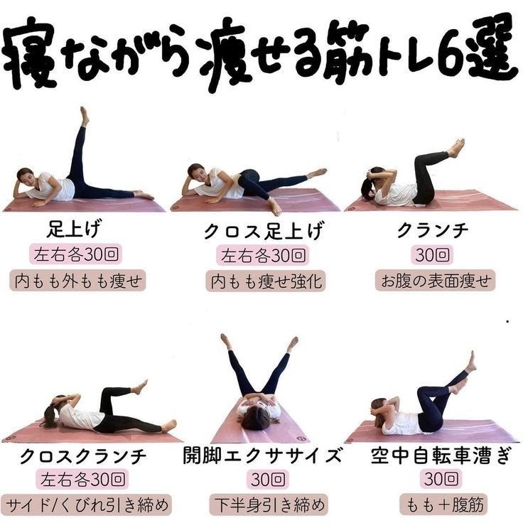 ✨強度高めで太ももスッキリ!✨ \寝ながら足痩せ体操 ▽こんな方におすすめ 脚をスッキリ魅せたい方 2分間チャレンジ! 1. 仰向けに 寝ます 2. 右足をまっすぐ上げて、左に倒していきましょう 3. 上げて倒すを10回繰り返します 4. 反対側も同じように行。