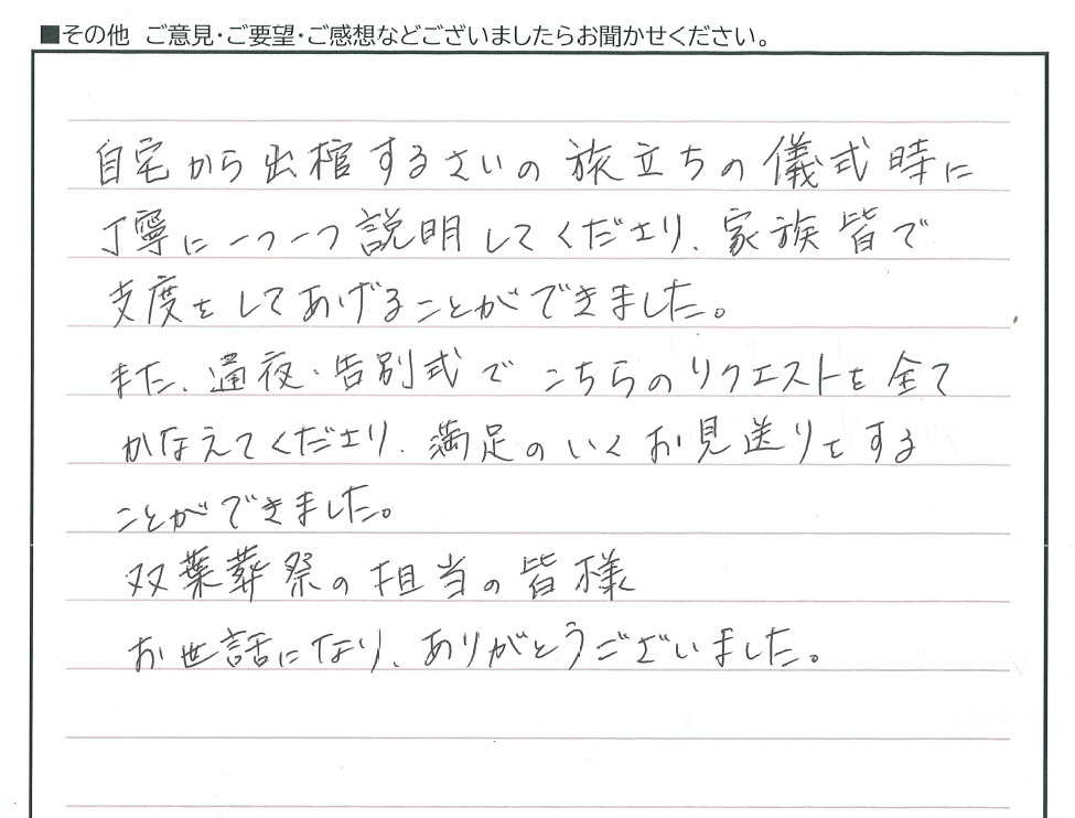 お客さまへのインタビュー 出棺時に実家の前で停車してくれた心遣いに感謝葬儀・家族葬なら よりそうお葬式。