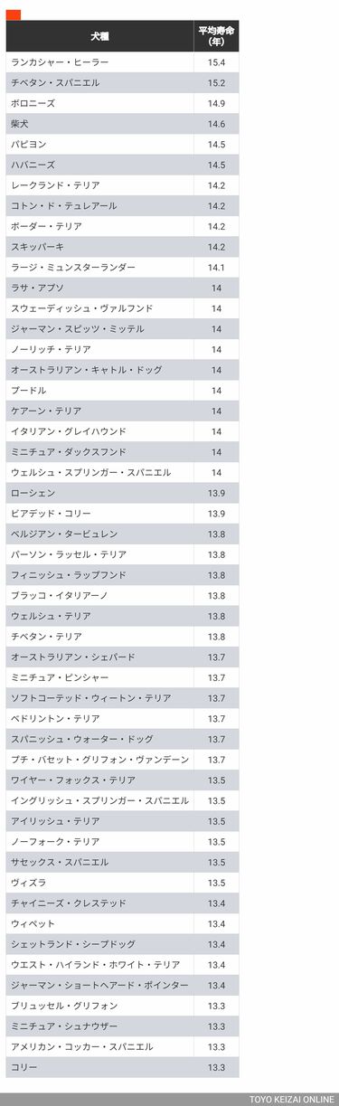 判明!柴犬は14.6歳、「犬種別の平均寿命」一覧 イギリスの研究でわかった長生きする犬種The New York Times東洋経済オンライン。