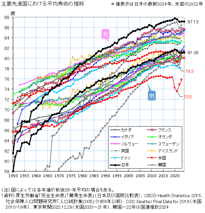 平均寿命は女性87.45歳、男性81.41歳でともに過去最高 : 女性の過半数が90歳まで生きるnippon.com。