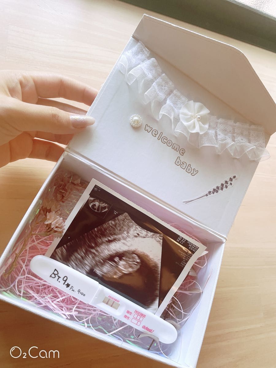 妊娠報告𓂃𓈒𓏸︎︎︎︎ 🕊 陽性反応が出た次の日、 絶対やりたいと思ってた 旦那さんへの妊娠報告サプライズ! 旦那さんに渡すと「えー!なにー😙今日何か記念日だったっけ?俺何も準備してないよー💦」 って🤣 開けるとフリーズやっと理解出来たのか 「本当に。