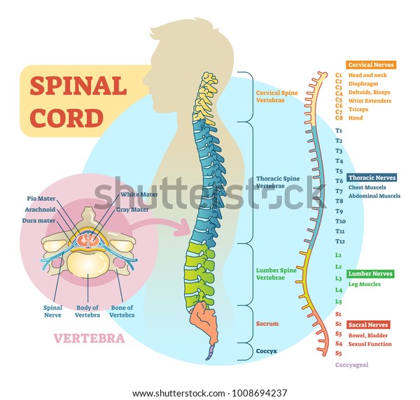 すべての断面を持つ脊髄回路図 – 頸椎、胸椎、木材脊椎、仙骨、尾骨。椎骨図。」のベクター画像素材 ロイヤリティフリー1008694237Shutterstock。